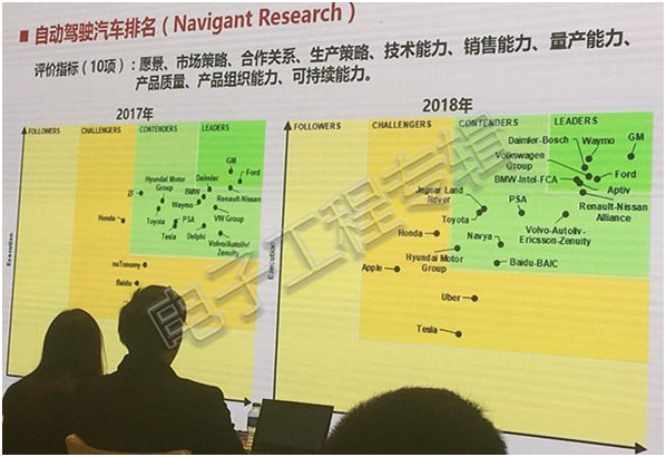 從技術(shù)成熟度上來(lái)看,頭部企業(yè)進(jìn)展迅猛,但由此帶來(lái)的兩極分化也很明顯,除了那些我們熟悉的大廠,其他都在做分母。產(chǎn)業(yè)化能力上,傳統(tǒng)車企占據(jù)優(yōu)勢(shì),在成波教授曬出的一張圖上,我們看到美國(guó)研究咨詢公司Navigant Research對(duì)2018年自動(dòng)駕駛企業(yè)做的一個(gè)排名,通用汽車、福特、大眾、寶馬、戴姆勒等傳統(tǒng)車企處于第一梯隊(duì),而Waymo、Aptiv這些技術(shù)性新興企業(yè)也表現(xiàn)搶眼。