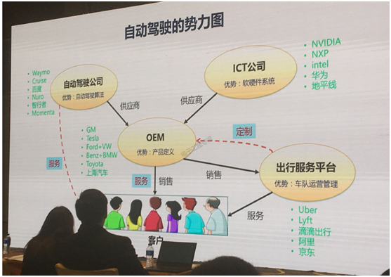 主機(jī)廠處于弱勢(shì),又沒(méi)有自動(dòng)駕駛需要相關(guān)的團(tuán)隊(duì)、技術(shù)、市場(chǎng),怎么辦?組織生態(tài)聯(lián)盟自救,逐漸就形成了上圖的一個(gè)勢(shì)力圖。一個(gè)是原來(lái)占龍頭地位的主機(jī)廠OEM;一個(gè)是做自動(dòng)駕駛方案的,以Waymo、Cruise、百度、Momenta這些初創(chuàng)公司為代表的;再來(lái)是英偉達(dá)、英特爾、華為、地平線這些做ICT,以及博世這類做芯片、操作系統(tǒng)、平臺(tái)、架構(gòu)的公司,主導(dǎo)軟硬件系統(tǒng);還有一個(gè)新勢(shì)力就是出行平臺(tái),像Uber、滴滴,物流方面阿里和京東也進(jìn)入了。