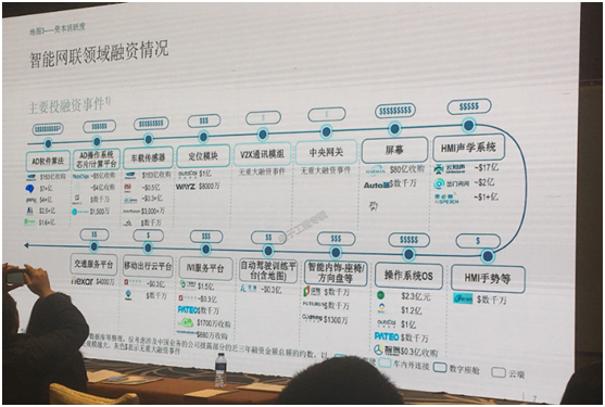 下圖是基于2017年的數(shù)據(jù),我們可以看到,像軟件算法、車載傳感器、屏幕都是投資熱點(diǎn),大家可以在里面得到一些啟示。
